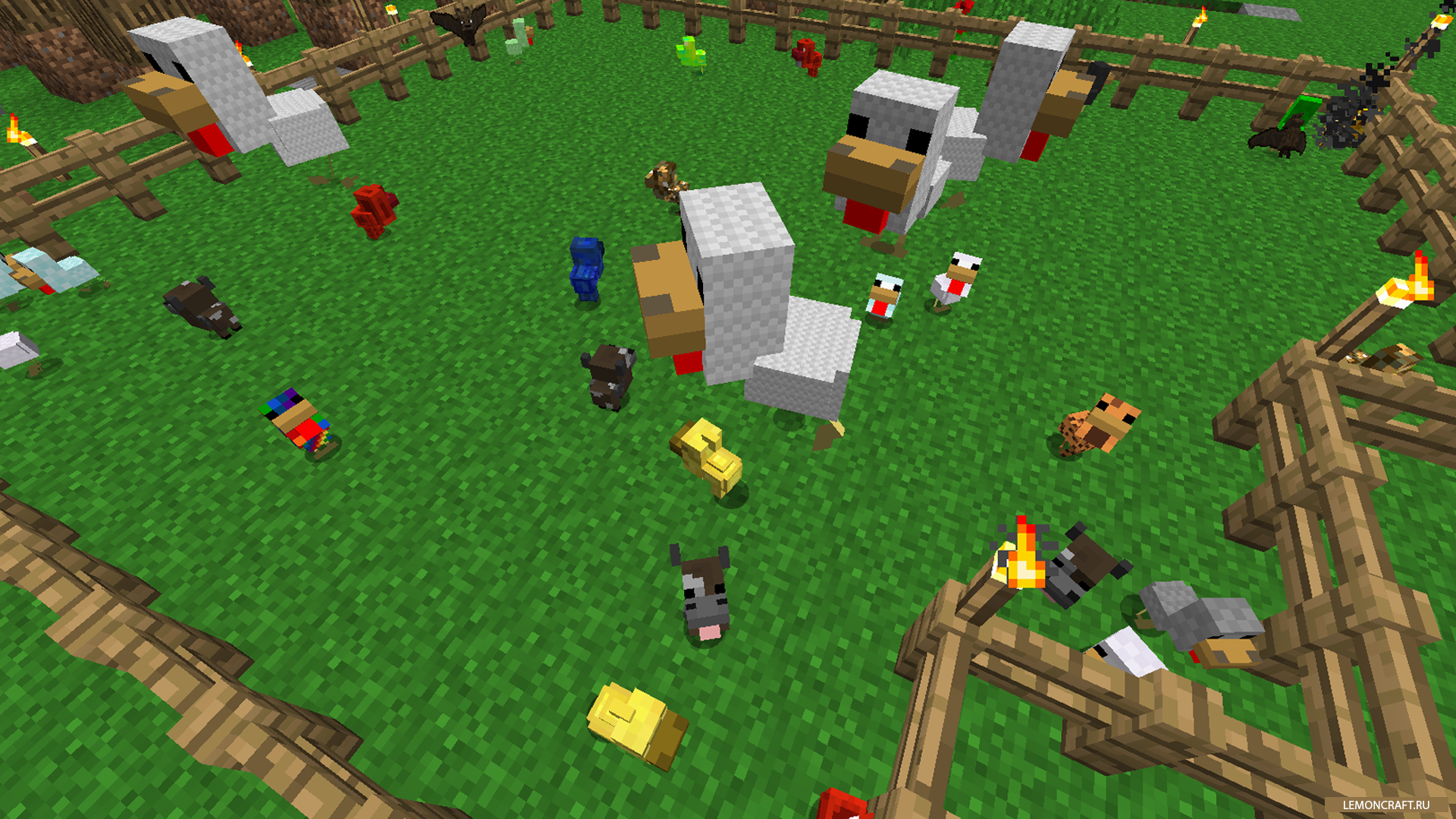 Благодаря моду Chickens теперь куры начнут приносить не только перья и яйца, но и другие полезные ресурсы. Так же куры имеют многоуровневую систему. Вы сможете их прокачать. Ресурсы, добываемые курицами следующие: порох, костная мука, снежки. Если объединить несколько куриц можно получить железо, алмазы и золото.